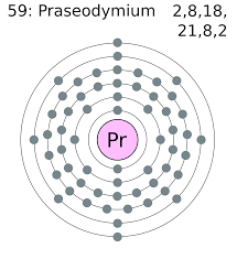 gốc từ tiếng Hy-Lạp “Praso” nghĩa là màu xanh cây tỏi và tiếng“didymos” nghĩa là đôi hay song sinh, mang ký hiệu Pr, số nguyên tử là 59, dùng làm nam châm, tia Laser(Light Amlifier Stimulation Emission Radiation), màu xanh lục trong kính và men sứ, đá lửa.